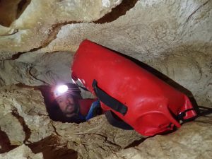C’est donc Cécile et Marie qui s’engagèrent, pendant que Nico décidait que finalement, il allait passer le reste de sa gueule de bois dans son poncho point chaud. Cécile et Marie passent l’étroiture et explorent le méandre suivant. Nous nous déshabillâmes et les suivîmes, pour attendre au milieu du méandre que Marie équipe les derniers puits. Simon en profita pour sortir le jambon, moi pour rajouter une couche. Parce qu’il commençait à faire faim, mais il faisait surtout froid.