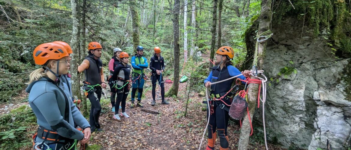 Une petite marche d’approche de 10 min en slip (eh oui) nous permet d’atteindre le départ du canyon, où nous enfilons combi, casques et baudriers. Les encadrants en profitent pour nous apprendre (ou nous rappeler) les manips de bases : la descente en rappel sur descendeur ou la confection d’une clé de blocage n’ont plus de secret pour nous.