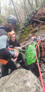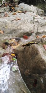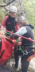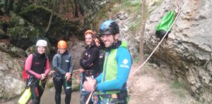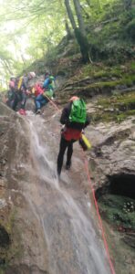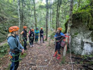 Certains participants expérimentés ont l’occasion de poser les mains courantes et les rappels pour le groupe. C’est notamment le cas pour la dernière cascade, la plus longue du parcours, où deux rappels sont posés en parallèle. Une fois regroupés en bas de la chute d’eau, il ne manque plus que les 3 Totally Spies Léonor Julien et Etienne qui descendent le rappel à la vitesse de l’éclair. Les cordes lovées et le groupe au complet, nous remontons plus dignes qu’à l’allée (en combi oui oui). A la voiture, un rayon de soleil nous attend pour casser la croute avant l’orage. Et c’est la fin de cette chouette sortie de fin d’été, merci à l’équipe Canyon pour l’organisation, l’encadrement et la bonne ambiance !