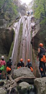 Et là c’est parti, petite marche aquatique, bassins et glissades s’offrent à nous avant d’entamer la première main courante suivi d’un rappel posé par les bénévoles. La roche calcaire est râpeuse sous le passage de l’eau, mais gare à ne pas trop s’écarter, de fines algues glissantes rendent parfois la descente un peu plus périlleuse. Le canyon se poursuit avec une succession de cascades (ou de douches), de petite vasques et de passages où le lit est plus étalé, rendant le parcours adapté à tous niveaux.