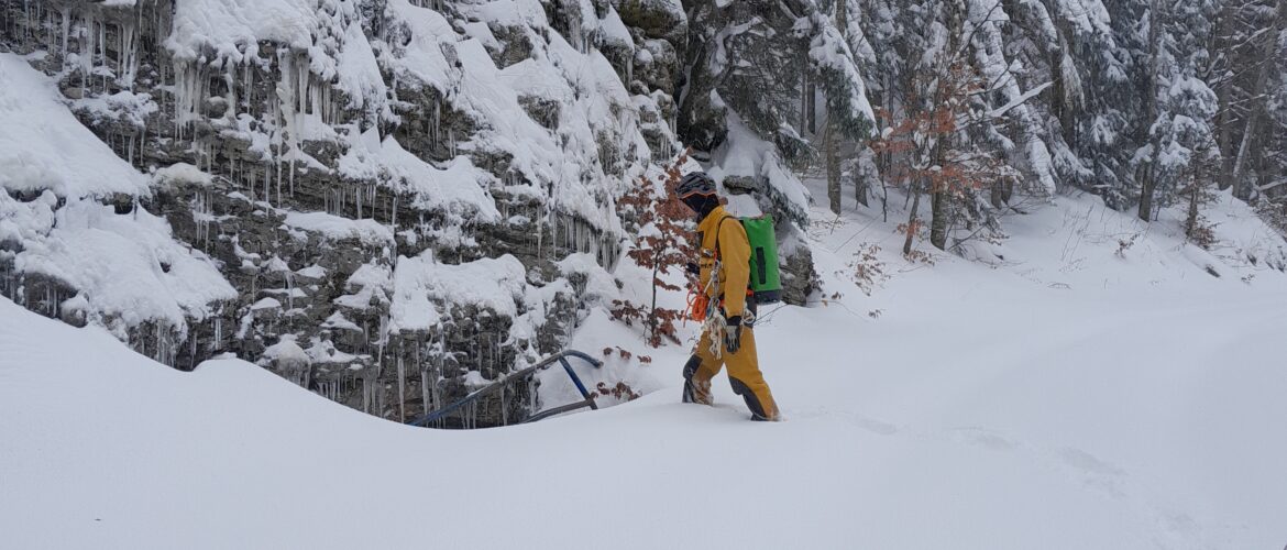 Ça y est, cette semaine marque le début de la spéléo hivernale avec approche les pieds dans la neige. Au vu des rafales à 100km/h et 20cm de neige annoncés, on se dit qu’une cavité avec pas trop d’approche sera probablement plus appropriée que notre choix initial ! On part donc sur le TQS, une découverte pour Stan et moi et un lointain souvenir pour Alexis.