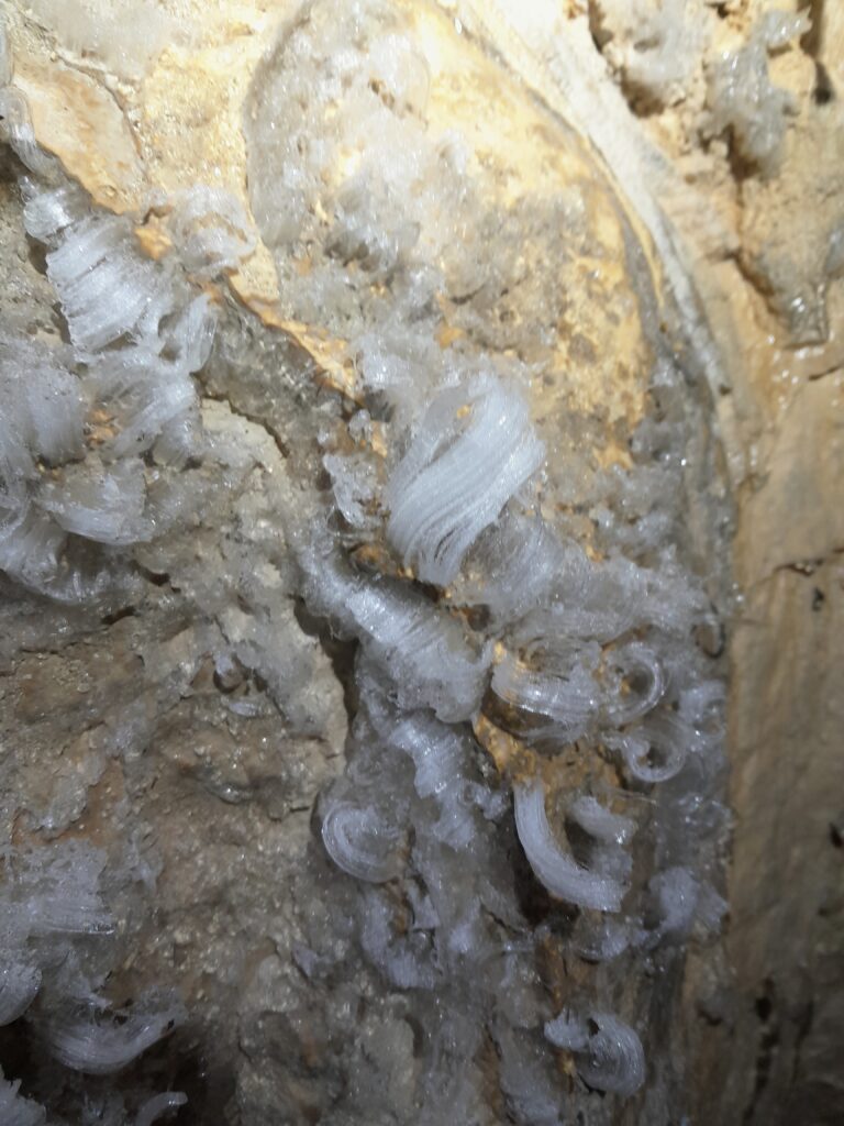 Dès la sortie du P30, on commence à sentir la baisse de température et arrivés en bas du puits d’entrée, tout le matos a gelé sur le baudrier… On prend quand même le temps d’observer les magnifiques fleurs de glace qui se sont formées, avant de sortir et foncer vers la voiture. « Quelqu’un a récupéré le thermos qu’on a laissé en bas du premier puits ? » Euhhh… C’est le début des péripéties du retour.