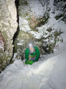 On rentre dans le trou par un toboggan tapissé de neige, c’est l’éclate. Puis Lucie commence à équiper le ressaut. S’ensuit le P16 avec sa tête de puits malcommode mention spéciale pour les gens qui mesurent moins d’1m90… On ne trouve pas de solution idéale pour se débarrasser du frottement sur la main courante d’accès au puits.