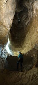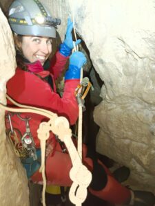 Après le ressaut suivant, Lucie nous fait une démonstration de jonction de cordes pour équiper un autre ressaut. Je prends donc la suite et installe les points suivants de la main courante et la tête de puits. En descendant, je m’aperçois non seulement que le ressaut ne fais pas 12m (ne correspond donc pas à la fiche d’équipement) et surtout que c’est une désescalade très facile et peu exposée qui ne nécessite pas de corde… Dubitatives, on décide finalement de la laisser là au risque de ne pas pouvoir aller jusqu’au méandre. S’ensuivent quelques pas de marche dans des éboulis le long d’un puits. Je décide de ne pas équiper le début de la main courante qui est très facile mais exposée afin de garder de la corde pour pouvoir au moins équiper les deux prochains puits, moyennant une jonction de corde. Je préviens les filles qui me rejoignent avec prudence. J’équipe le p9 avant de passer la main à Ana qui s’occupe de la main courante et du p17 en jonglant avec les longueurs de cordes restantes. Ça se goupille plutôt bien et on parvient au bas du P17 sans encombre mais à cours de matos pour le dernier puits…