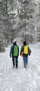 Au parking, c’est beau temps belle neige. Skieurs de fonds et raquettistes nous regardent avec curiosité. On s’élance toutes guillerettes dans la poudreuse légère, c’est bôôô. Lucie a étudié la marche d’approche en détail, elle a trouvé 3 points GPS différents (ça sent déjà le roussi) et a pour seule info fiable que le point GPS de l’IGN est pas bon. Et de mon côté, j’ai l’info que le point GPS d’open topo est pas bon non plus… Non mais on va suivre la description, 10min de marche d’approche, ça doit pas être sorcier. Et c’est parti pour non pas 10min, mais DEUX HEURES de recherche active pour trouver le trou. L’ironie du sort dans tout ça : on a fini par trouver un point GPS bien placé et c’est celui de GOOGLE MAPS…