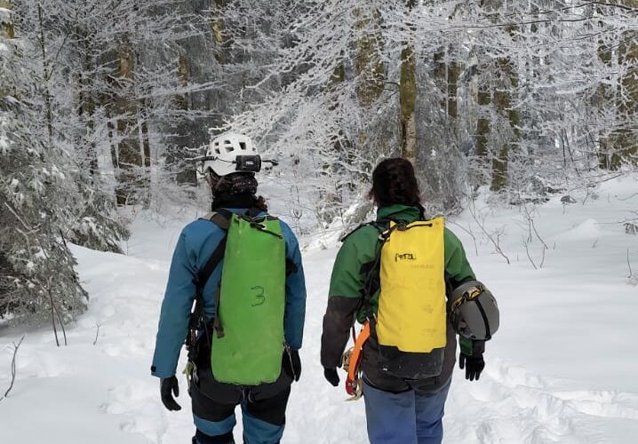 Au parking, c’est beau temps belle neige. Skieurs de fonds et raquettistes nous regardent avec curiosité. On s’élance toutes guillerettes dans la poudreuse légère, c’est bôôô. Lucie a étudié la marche d’approche en détail, elle a trouvé 3 points GPS différents (ça sent déjà le roussi) et a pour seule info fiable que le point GPS de l’IGN est pas bon. Et de mon côté, j’ai l’info que le point GPS d’open topo est pas bon non plus… Non mais on va suivre la description, 10min de marche d’approche, ça doit pas être sorcier. Et c’est parti pour non pas 10min, mais DEUX HEURES de recherche active pour trouver le trou. L’ironie du sort dans tout ça : on a fini par trouver un point GPS bien placé et c’est celui de GOOGLE MAPS…