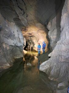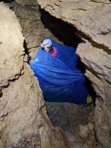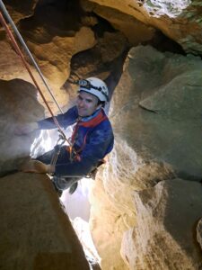 A l’intérieur il y a quand même un courant d’air froid… Heureusement que ça se calme un peu quand on ferme la porte. Lenette et Julien équipent le premier puits en double, et c’est au tour de Rémi et Axel pour le second. On fait des efforts pour équiper un peu hors crue, au cas où il pleuve à la remonté. On prend notre temps mais on fini par arriver à la salle hydrokarst.