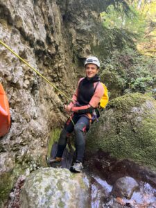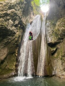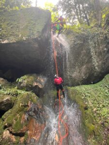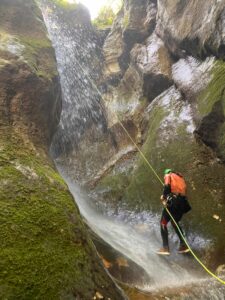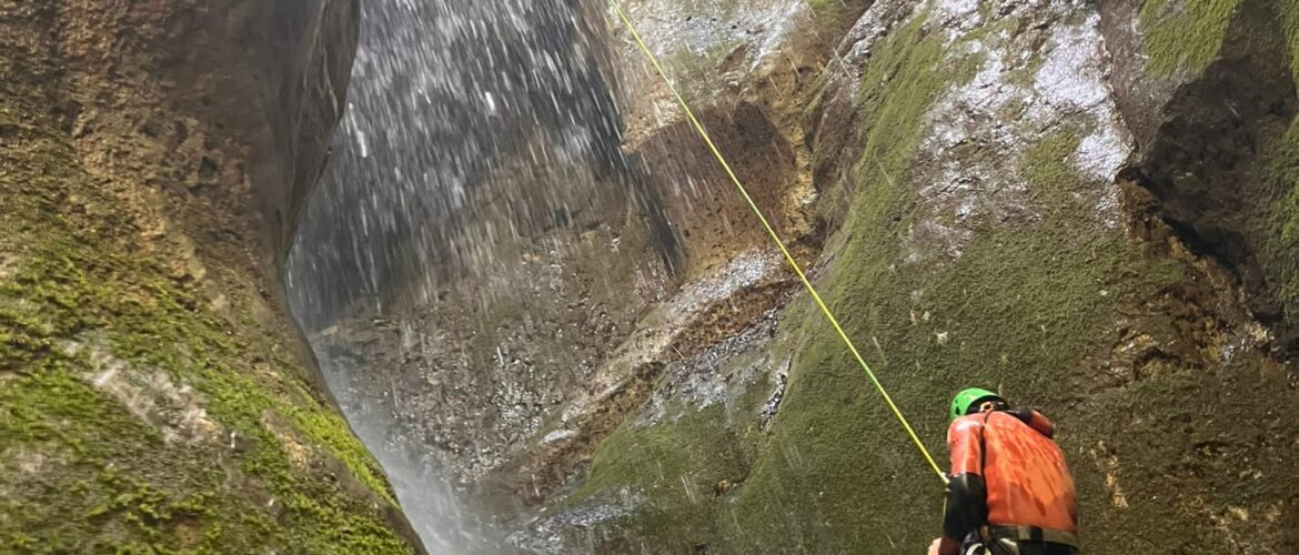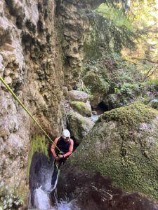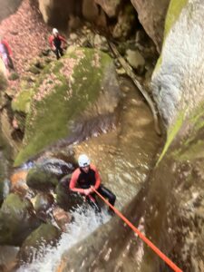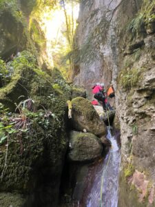 Après une montée bien raide, nous attaquons le canyon par du crapahutage entre branches et cailloux bien glissant. Le premier rappel arrive vite, Thibault nous montre rapidement l’installation, les principes de précautions et mains courantes, comment faire un rappel en canyoning etc. Luc au moins est bien content de découvrir le rappel sans machard sur un rappel gentil de quelques petits mètres.