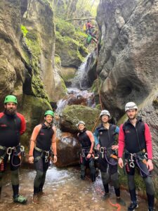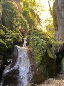 Ce canyon est un grand classique du coin, qu’il est agréable de parcourir au calme hors saison. Il est plus court (on y passe environ 2h), et davantage ludique aussi avec de grandes cascades tombant dans des vasques impressionantes permettant quelques sauts et tobogans. C’est avec angoisse que Luc decouvre la fourberie de Thibault a faire stopper la corde des rappels 2-3 m au dessus du niveau de l’eau, lui faisant un temps regretter le cailloux sec de l’escalade, mais tout se passe bien et tout le groupe passe un super moment avec des sauts (optionnels) jusqu’à ~6 m, Nicola prendra même du rab de saut.