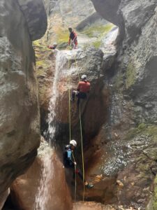 La marche entre les rappels se raccourci au fur et à mesure, et les plus à l’aise d’entre nous avec des cordes commencent rapidement à vouloir faire des nœuds et installer des rappels. Pas de tobogan ou de saut dans ce canyon, l’eau n’est jamais tres profonde. Les falaises autour de nous s’élèvent rapidement aussi pour devenir une belle gorge, dont le pinacle est une successions rapide de rappels verticaux plus longs (10-15 m) dans un cadre impressionnant. Le froid se fait neanmoins ressentir légèrement, et certains chassent les maigres trous de soleil pour se rechauffer en attendant le reste du groupe. La vegetation luxuriante dans cette gorge verdoyante nous enverrait presque sous les tropiques, seule la temperature nous ramène a la realité.